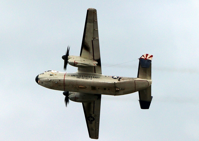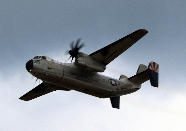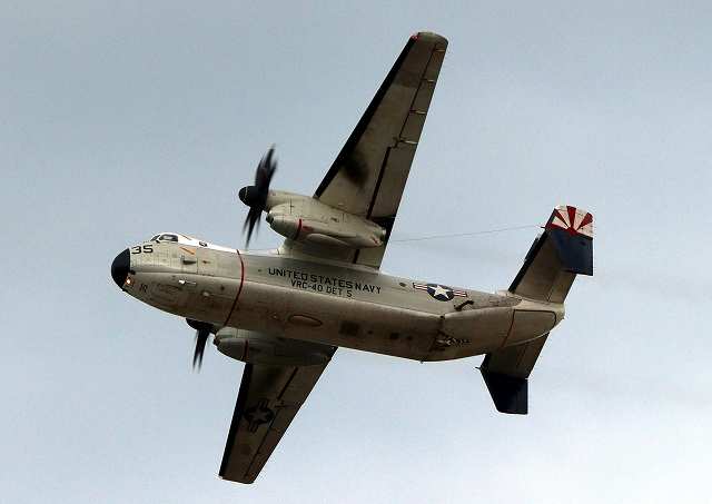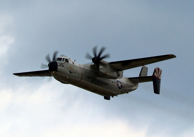 米海軍艦載機 C-2A グレイハウンド 空母連絡機(岩国基地)、35番機が旋回 |