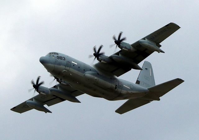 米海兵隊 KC-130J 空中給油機 スーパーハーキュリーズ(岩国基地)、QD 7983番機が離陸 |