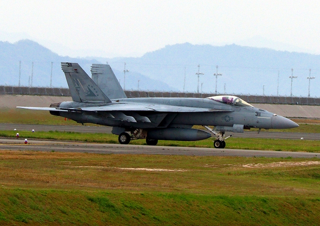米海軍艦載機 F/A-18E スーパーホーネット 戦闘攻撃機(岩国基地)、NF、311番機が着陸 12時48分に離陸した機。1時間48分の飛行でした。」 |