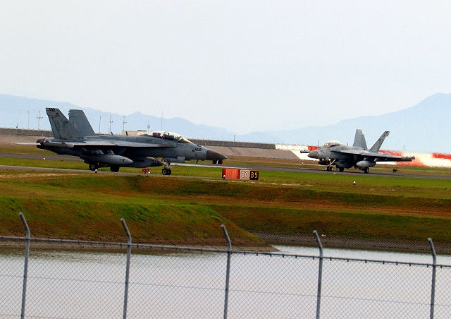 米海軍艦載機 F/A-18F スーパーホーネット 戦闘攻撃機(岩国基地)、NF、103番機が着陸 14時49分に離陸した機。23分間の飛行でした。 |
