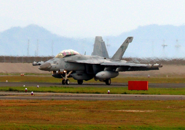 米海軍艦載機 EA-18G グラウラー 電子戦戦闘攻撃機(岩国基地)、NF、502番機が着陸 13時16分に離陸した機。1時間54分の飛行でした。 |