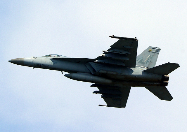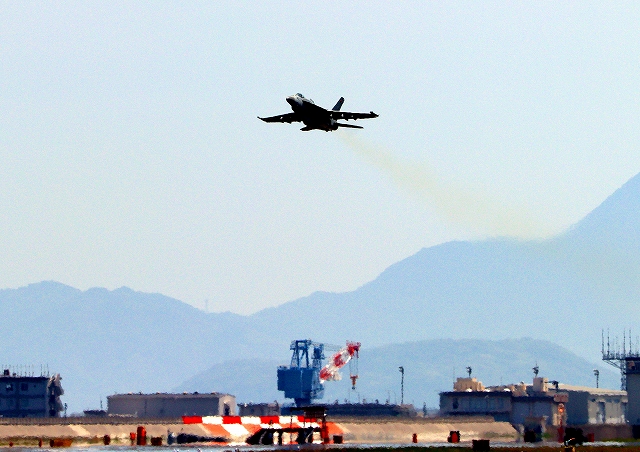 米海軍艦載機 F/A-18E スーパーホーネット 戦闘攻撃機(岩国基地)、NF、312番機が離陸 |