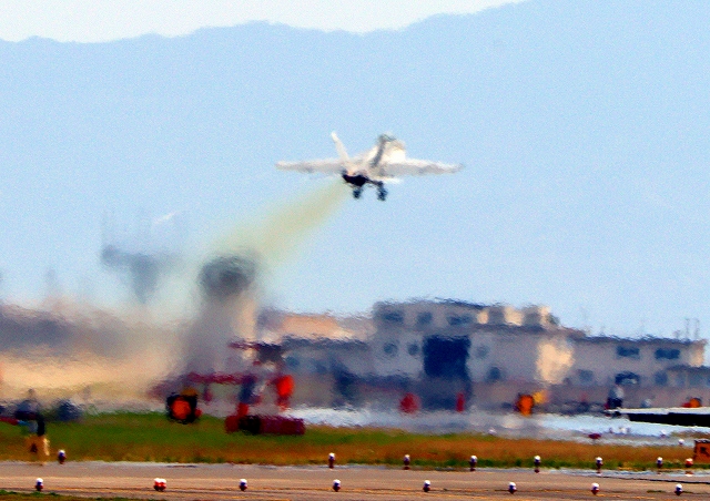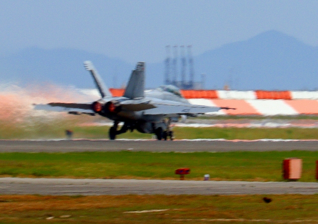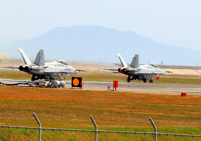 米海軍艦載機 F/A-18F スーパーホーネット 戦闘攻撃機(岩国基地)、NF、113番機が離陸 |