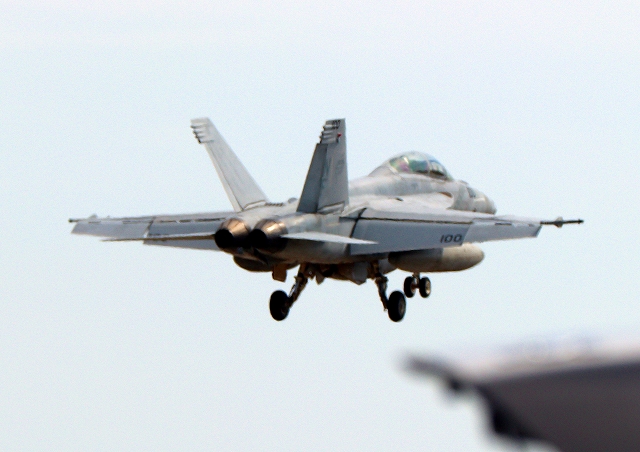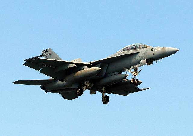 米海軍艦載機 F/A-18F スーパーホーネット 戦闘攻撃機(岩国基地)、NF、100番機が着陸 |