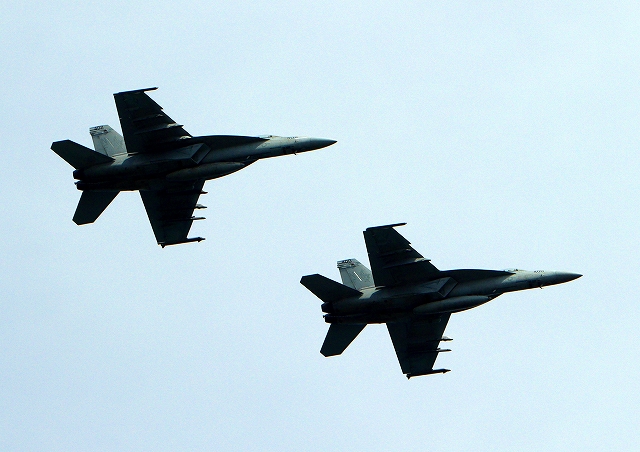 米海軍艦載機 F/A-18E スーパーホーネット 戦闘攻撃機(岩国基地)、NF、400番機、402番機が2機編隊で帰還 |