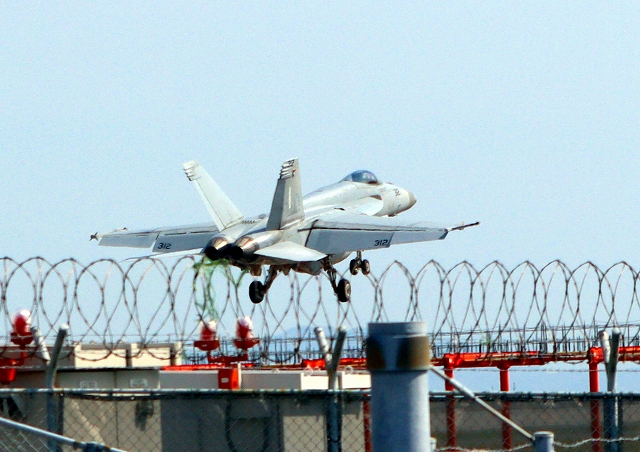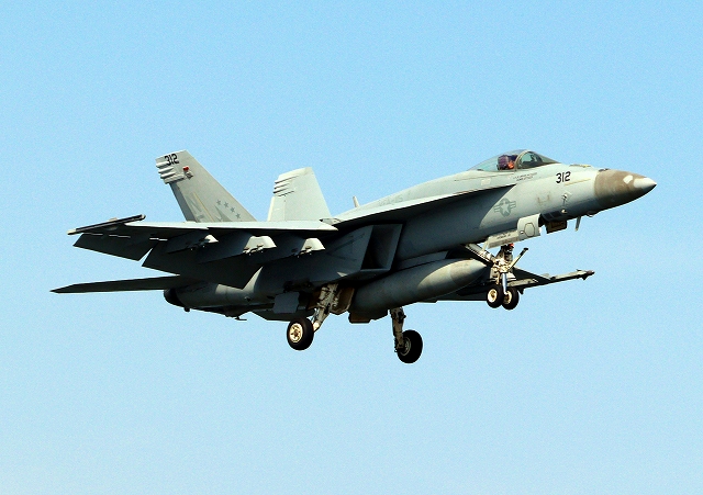 米海軍艦載機 F/A-18E スーパーホーネット 戦闘攻撃機(岩国基地)、NF、312番機が着陸 13時50分に離陸した機。1時間47分の飛行でした。 |