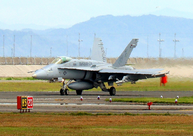 米海兵隊 F/A-18C ホーネット 戦闘攻撃機(岩国基地)、WK、14番機が着陸 |