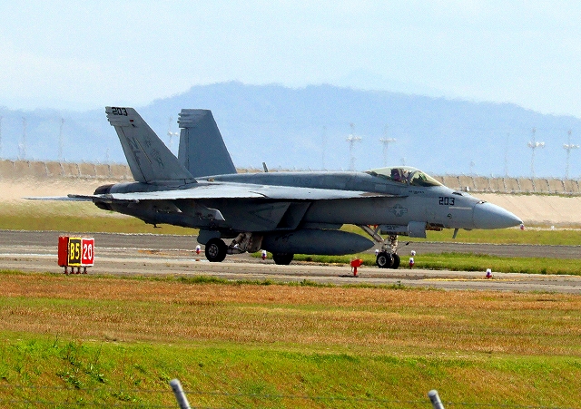 米海軍艦載機 F/A-18E スーパーホーネット 戦闘攻撃機(岩国基地)、NF、203番機が着陸 |