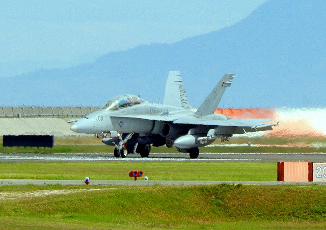 米海軍艦載機 F/A-18F スーパーホーネット 戦闘攻撃機(岩国基地)、NF、106番機が着陸 |