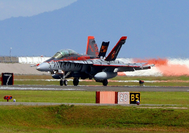 米海軍艦載機 F/A-18E スーパーホーネット 戦闘攻撃機(岩国基地)、NF、402番機が着陸 |