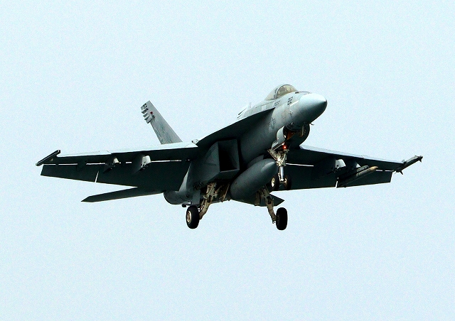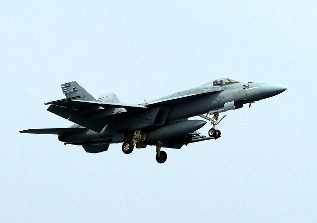 米海軍艦載機 F/A-18E スーパーホーネット 戦闘攻撃機(岩国基地)、NF、212番機が着陸 |