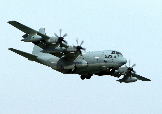 米海兵隊 KC-130J 空中給油機 スーパーハーキュリーズ(岩国基地)、QD 7983番機が旋回 |