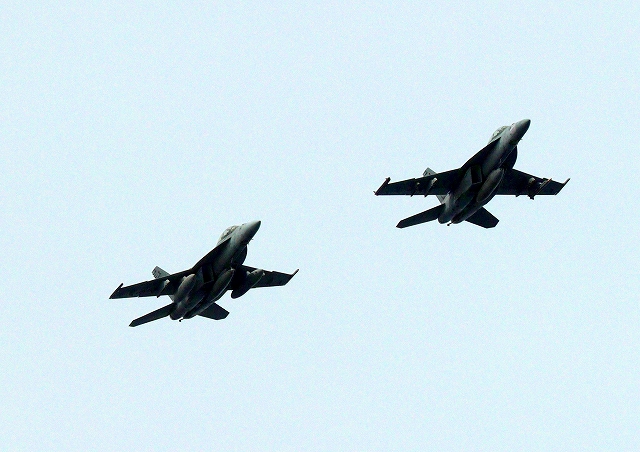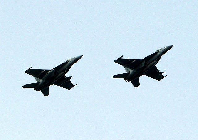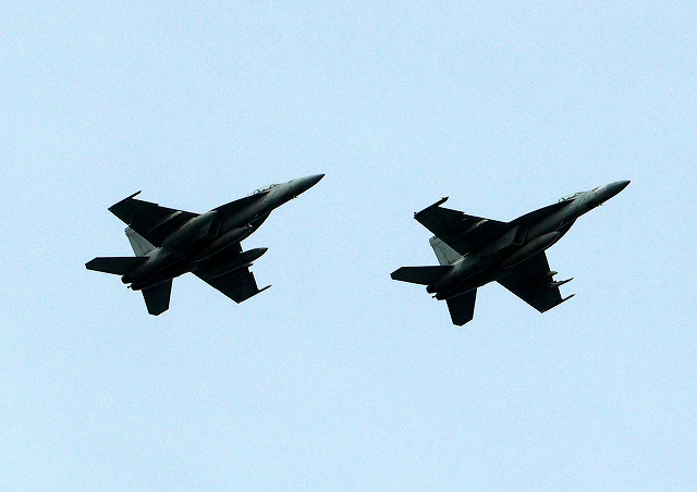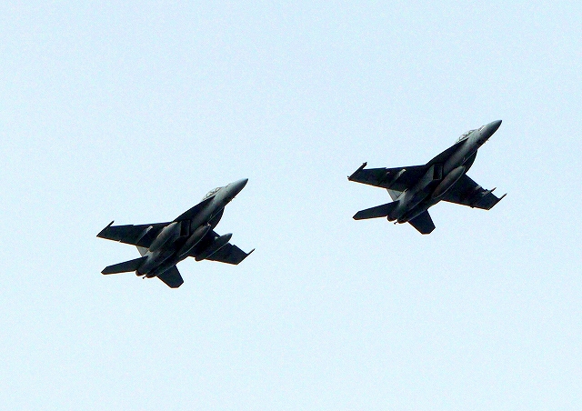 米海軍艦載機 F/A-18F スーパーホーネット 戦闘攻撃機(岩国基地)、NF、105番機、114番機が2機編隊で帰還 |