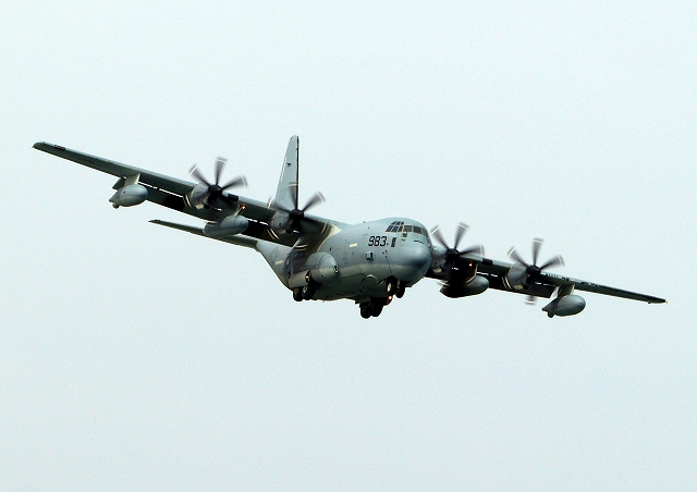 米海兵隊 KC-130J 空中給油機 スーパーハーキュリーズ(岩国基地)、QD 7983番機が着陸 |