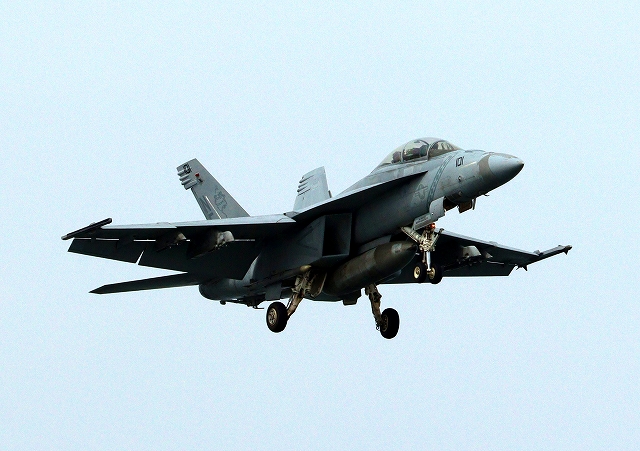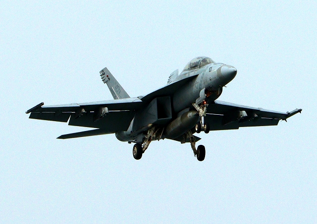 米海軍艦載機 F/A-18F スーパーホーネット 戦闘攻撃機(岩国基地)、NF、101番機が着陸 |