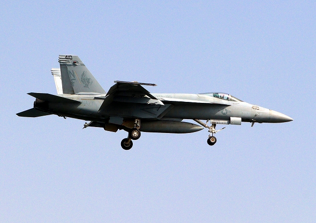 米海軍艦載機 F/A-18E スーパーホーネット 戦闘攻撃機(岩国基地)、NF、410番機が帰還 |