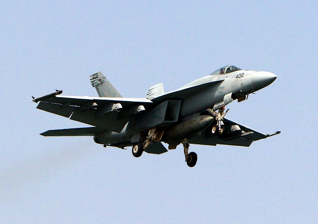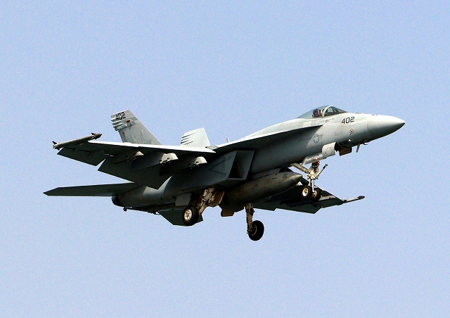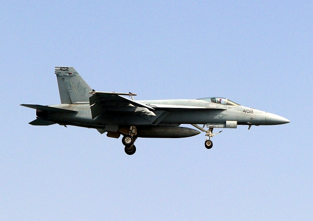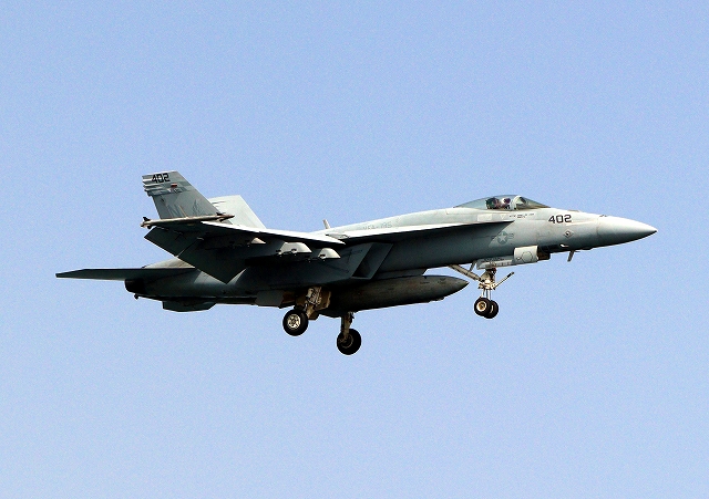 米海軍艦載機 F/A-18E スーパーホーネット 戦闘攻撃機(岩国基地)、NF、402番機が帰還 |