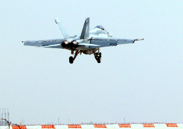米海軍艦載機 F/A-18E スーパーホーネット 戦闘攻撃機(岩国基地)、NF、402番機が着陸 |