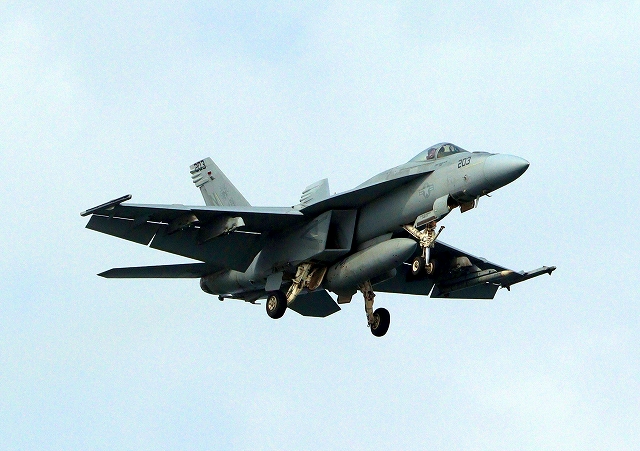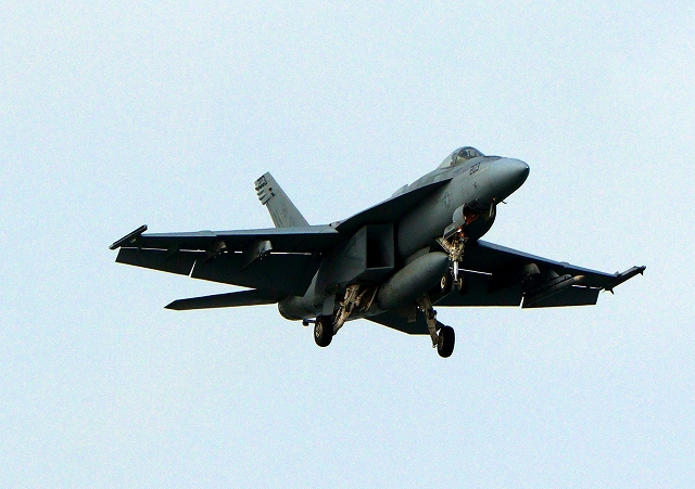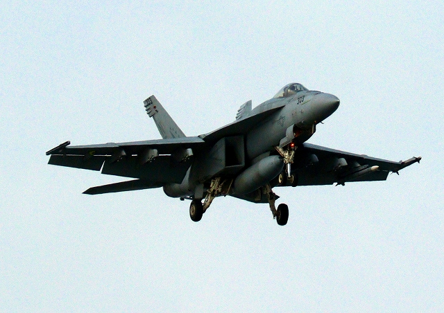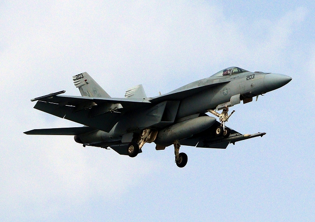 米海軍艦載機 F/A-18E スーパーホーネット 戦闘攻撃機(岩国基地)、NF、203番機が帰還 |