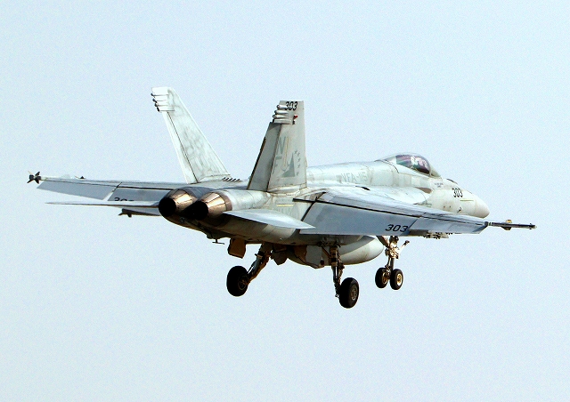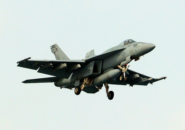 米海軍艦載機 F/A-18E スーパーホーネット 戦闘攻撃機(岩国基地)、NF、303番機が帰還 |