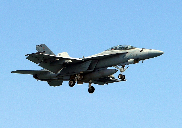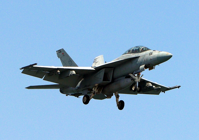 米海軍艦載機 F/A-18F スーパーホーネット 戦闘攻撃機(岩国基地)、NF、106番機が着陸 |
