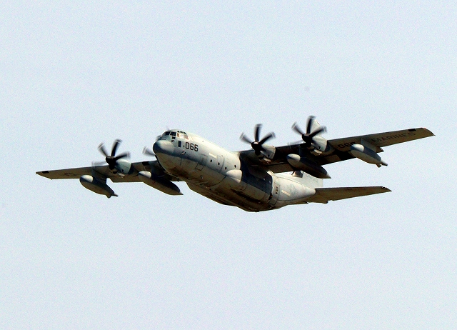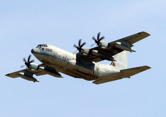 米海兵隊 KC-130J 空中給油機 スーパーハーキュリーズ(岩国基地)、QD 8066番機が離陸 |