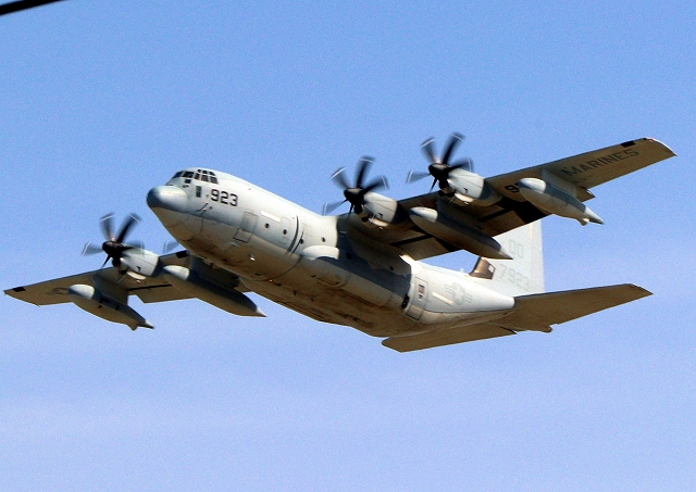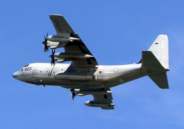 米海兵隊 KC-130J 空中給油機 スーパーハーキュリーズ(岩国基地)、QD 7983番機が離陸 |