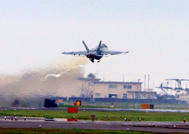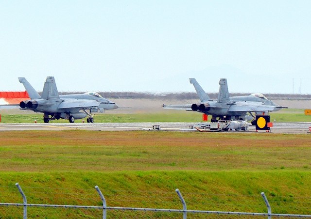 米海軍艦載機 F/A-18E スーパーホーネット 戦闘攻撃機(岩国基地)、NF、311番機が離陸 |