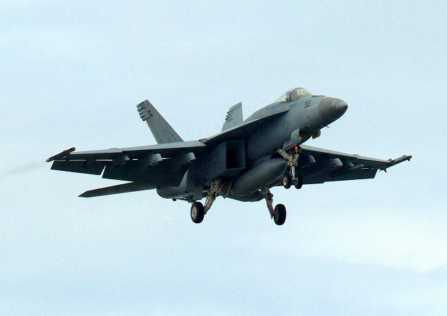 米海軍艦載機 F/A-18E スーパーホーネット 戦闘攻撃機(岩国基地)、NF、312番機が着陸