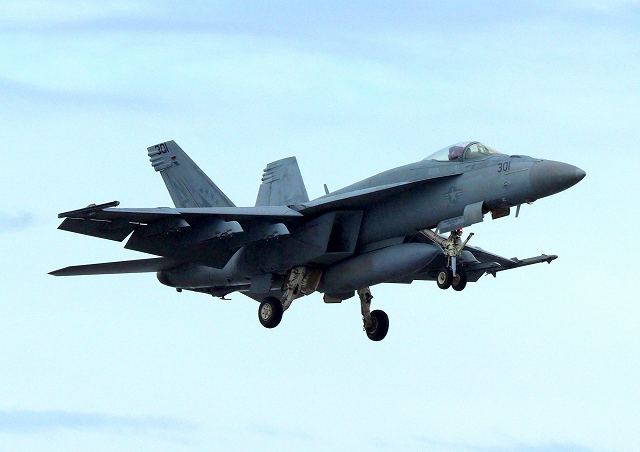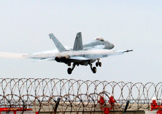 米海軍艦載機 F/A-18E スーパーホーネット 戦闘攻撃機(岩国基地)、NF、301番機が着陸