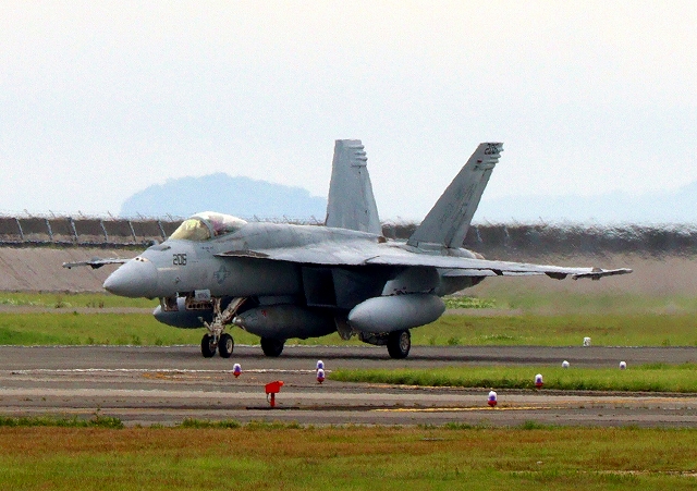 米海軍艦載機 F/A-18E スーパーホーネット 戦闘攻撃機(岩国基地)、NF、206番機が着陸 |