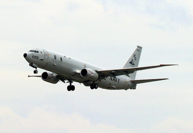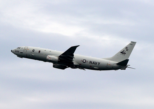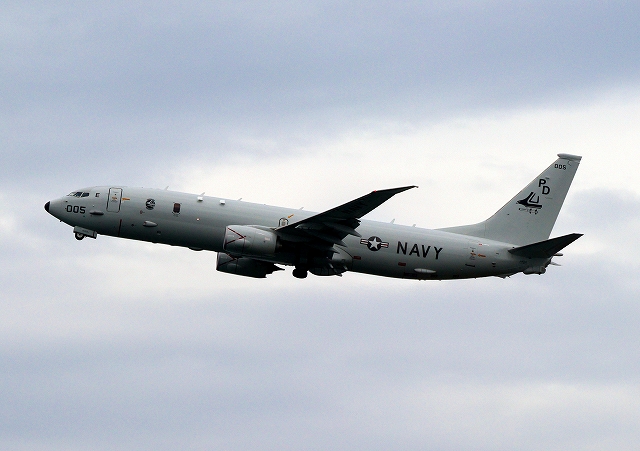 米海軍 P-8A 海上哨戒機 ポセイドン(嘉手納基地、三沢基地)、PD、005番機が旋回 |