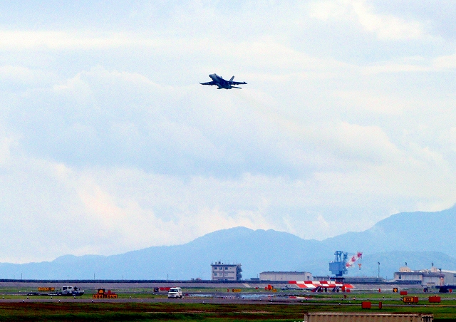 米海軍艦載機 F/A-18E スーパーホーネット 戦闘攻撃機(岩国基地)、NF、312番機が離陸 |