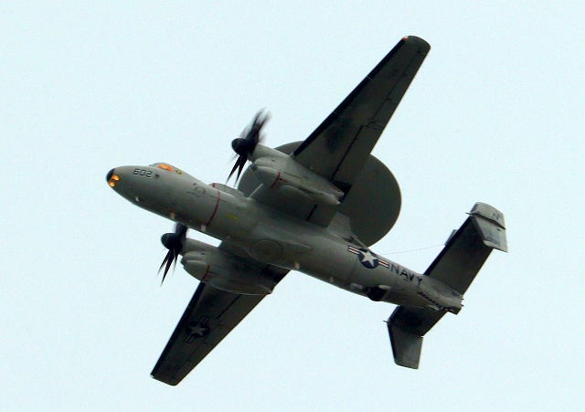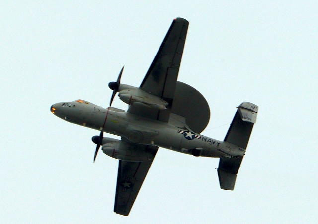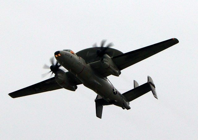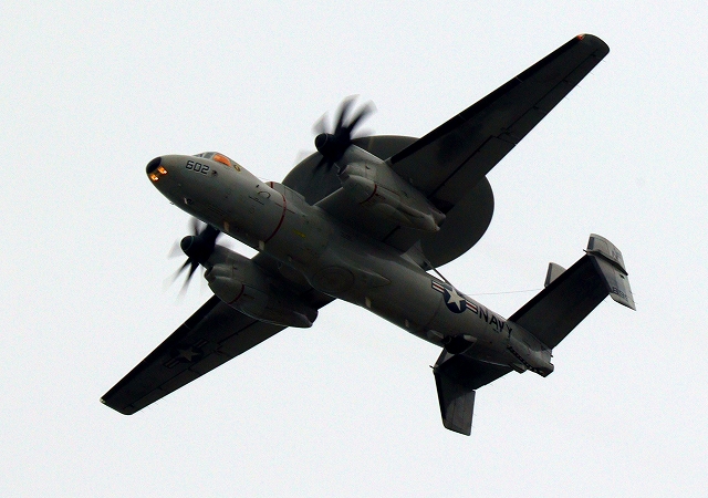 米海軍艦載機 E-2D アドヴァンスド・ホークアイ 早期警戒機(岩国基地)、602番機が旋回 |