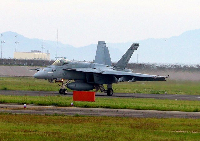米海軍艦載機 F/A-18E スーパーホーネット 戦闘攻撃機(岩国基地)、NF、404番機が着陸 |