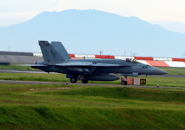 米海軍艦載機 F/A-18E スーパーホーネット 戦闘攻撃機(岩国基地)、NF、405番機が着陸 |