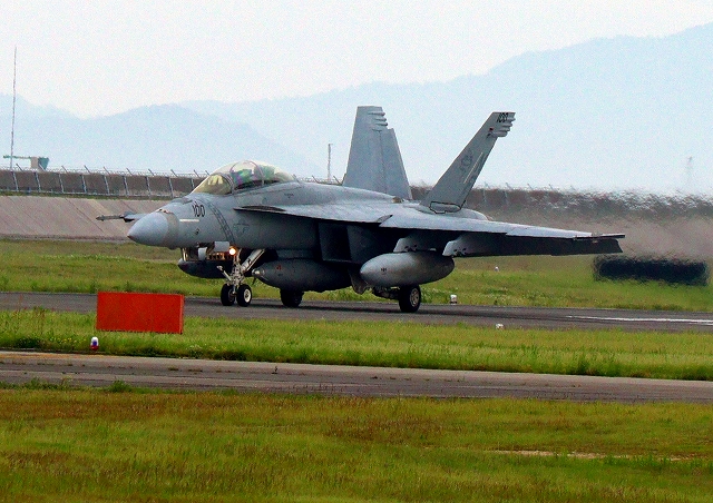 米海軍艦載機 F/A-18F スーパーホーネット 戦闘攻撃機(岩国基地)、NF、100番機が着陸 |