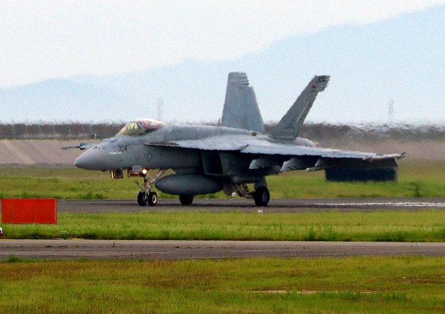 米海軍艦載機 F/A-18E スーパーホーネット 戦闘攻撃機(岩国基地)、NF、302番機が着陸 |