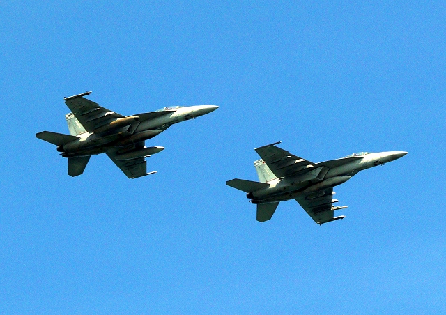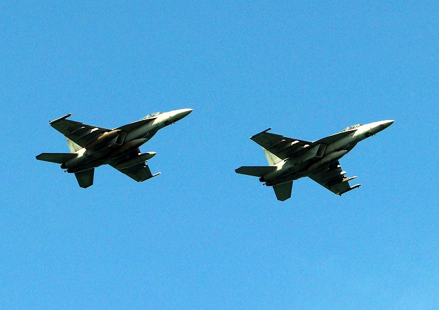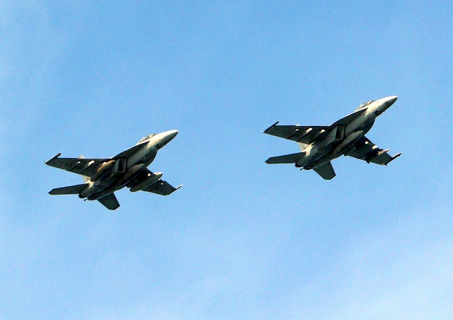 米海軍艦載機 F/A-18F スーパーホーネット 戦闘攻撃機(岩国基地)、NF、104番機、105番機が2機編隊で帰還 |