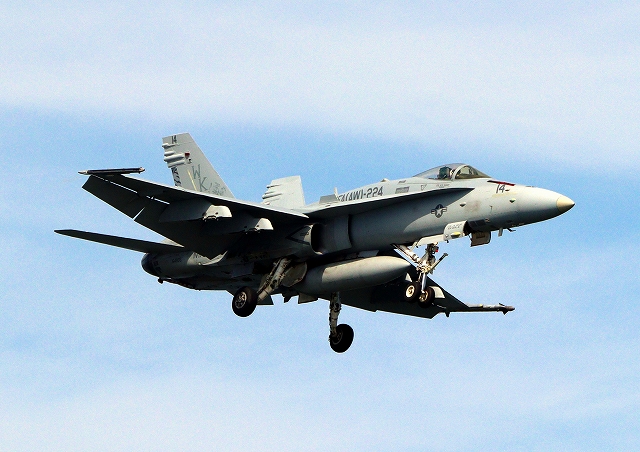 米海兵隊 F/A-18C ホーネット 戦闘攻撃機(岩国基地)、WK、14番機が着陸 |