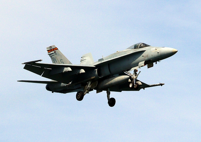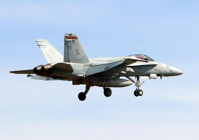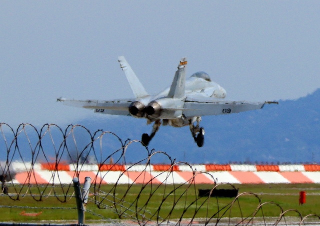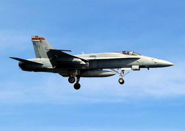米海兵隊 F/A-18C ホーネット 戦闘攻撃機(岩国基地)、WS、09番機が着陸 |