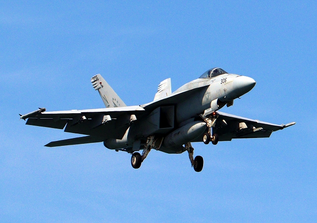 米海軍艦載機 F/A-18E スーパーホーネット 戦闘攻撃機(岩国基地)、NF、306番機が着陸 13時31分に離陸した機。1時間16分の飛行でした。 離陸の写真も撮っていますが、写真の数が多いのでアップしていません。 |
