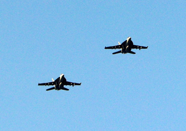 米海軍艦載機 F/A-18E スーパーホーネット 戦闘攻撃機(岩国基地)、NF、405番機、310番機が2機編隊で帰還 |