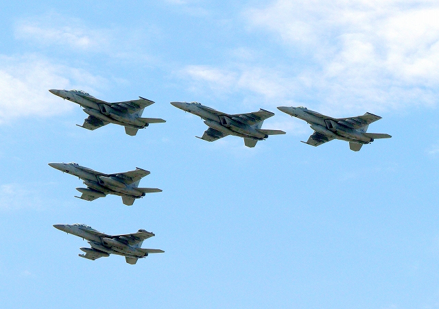 米海軍艦載機 F/A-18F/E スーパーホーネット 戦闘攻撃機(岩国基地)、NF、104番機、405番機、305番機、214番機、グラウラー NF 505番機が4機編隊で帰還 |