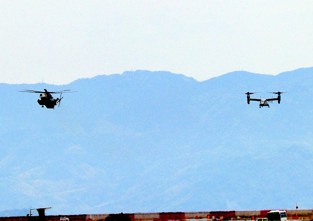米海兵隊 CH-53E 強襲大型輸送ヘリ スーパースタリオン、16番機、、 MV-22B オスプレイ(普天間基地)、「虎」、ET、04番機が帰還、旋回 |