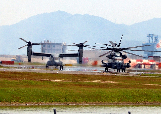 米海兵隊 CH-53E 強襲大型輸送ヘリ スーパースタリオン、16番機、、 MV-22B オスプレイ(普天間基地)、「虎」、ET、04番機が着陸、 |