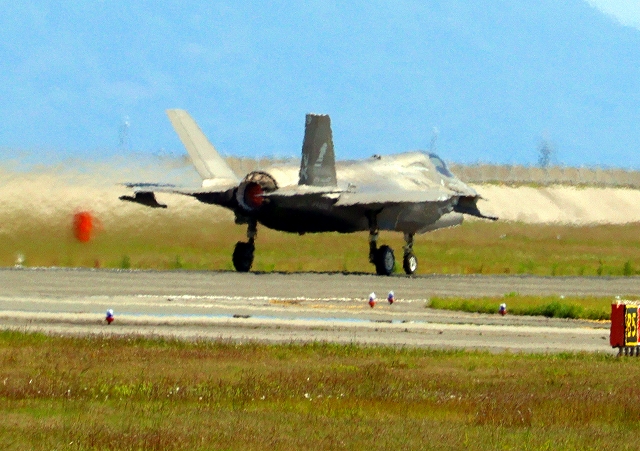 米海兵隊 F-35B ライトニングⅡ 戦闘機(岩国基地)、VK、01番機が離陸 |