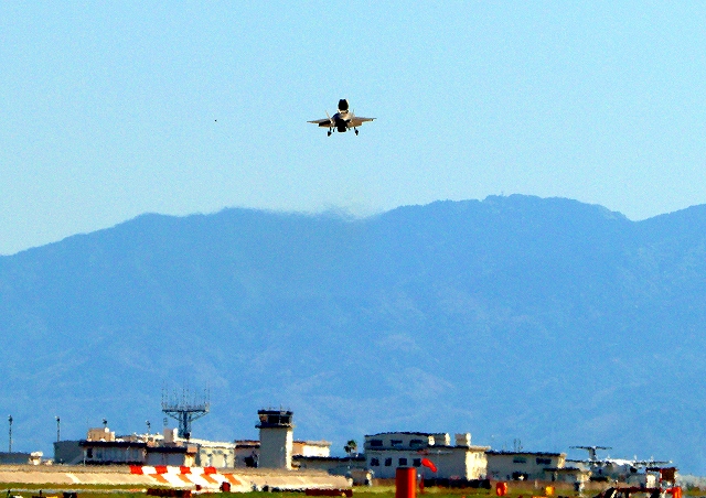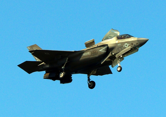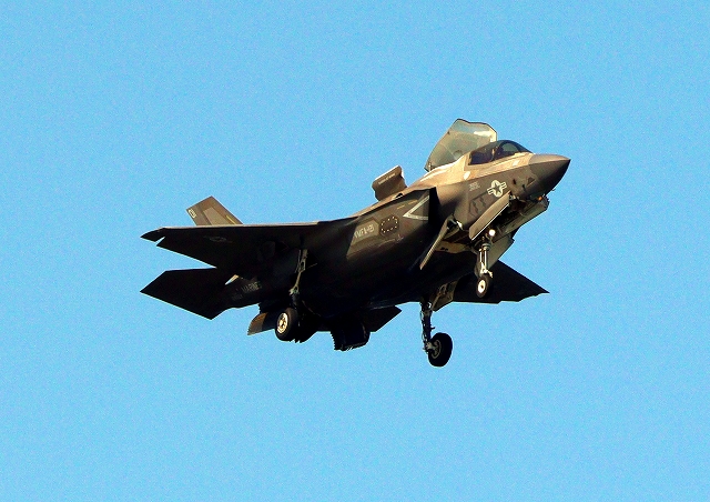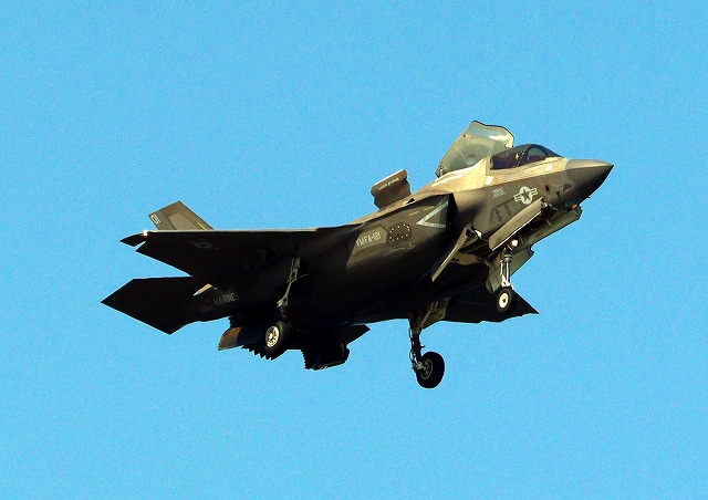 米海兵隊 F-35B ライトニングⅡ 戦闘機(岩国基地)、VK、01番機は垂直着陸パッドの上に。 |