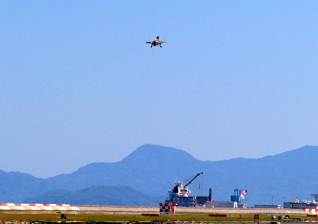 米海兵隊 F-35B ライトニングⅡ 戦闘機(岩国基地)、VK、01番機は新しい垂直着陸パッドの上でホバリング、着陸