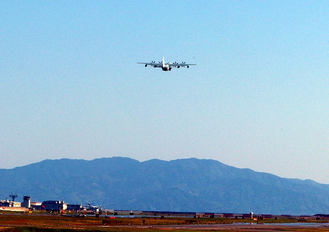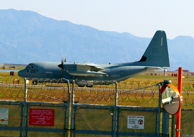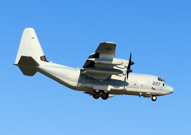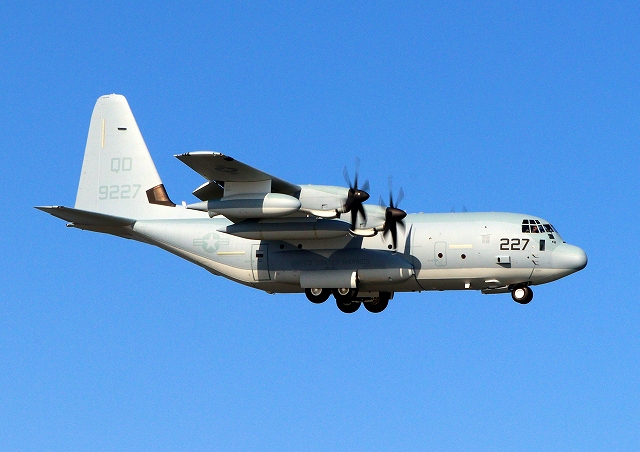 米海兵隊 KC-130J 空中給油機 スーパーハーキュリーズ(岩国基地)、QD 9227番機が着陸 |